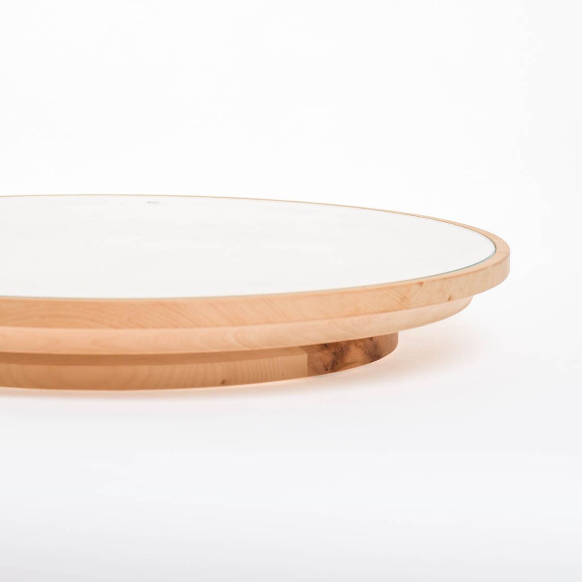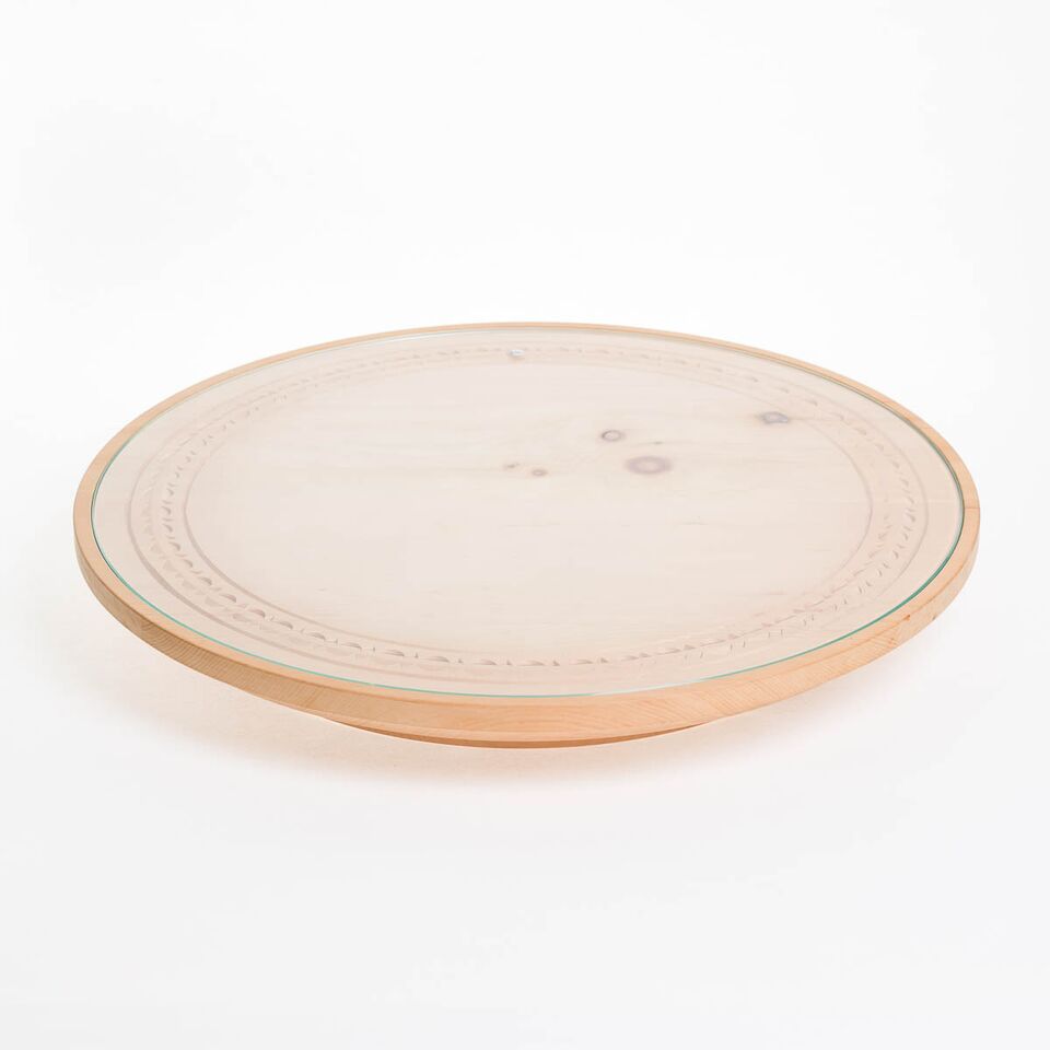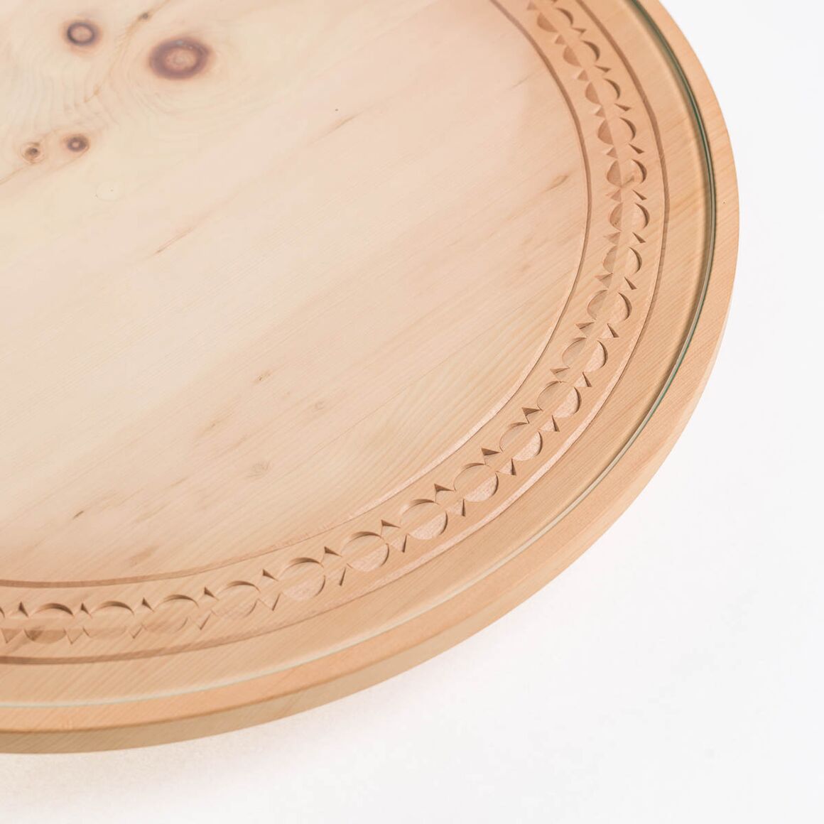 Drehteller in Arvenholz massiv. Drehteller mit ringsum (Schnitzerei-Band) geschnitzter Drehplatte und lose darauf gelegter Glasplatte. Die Glasplatte hat polierte Kanten.