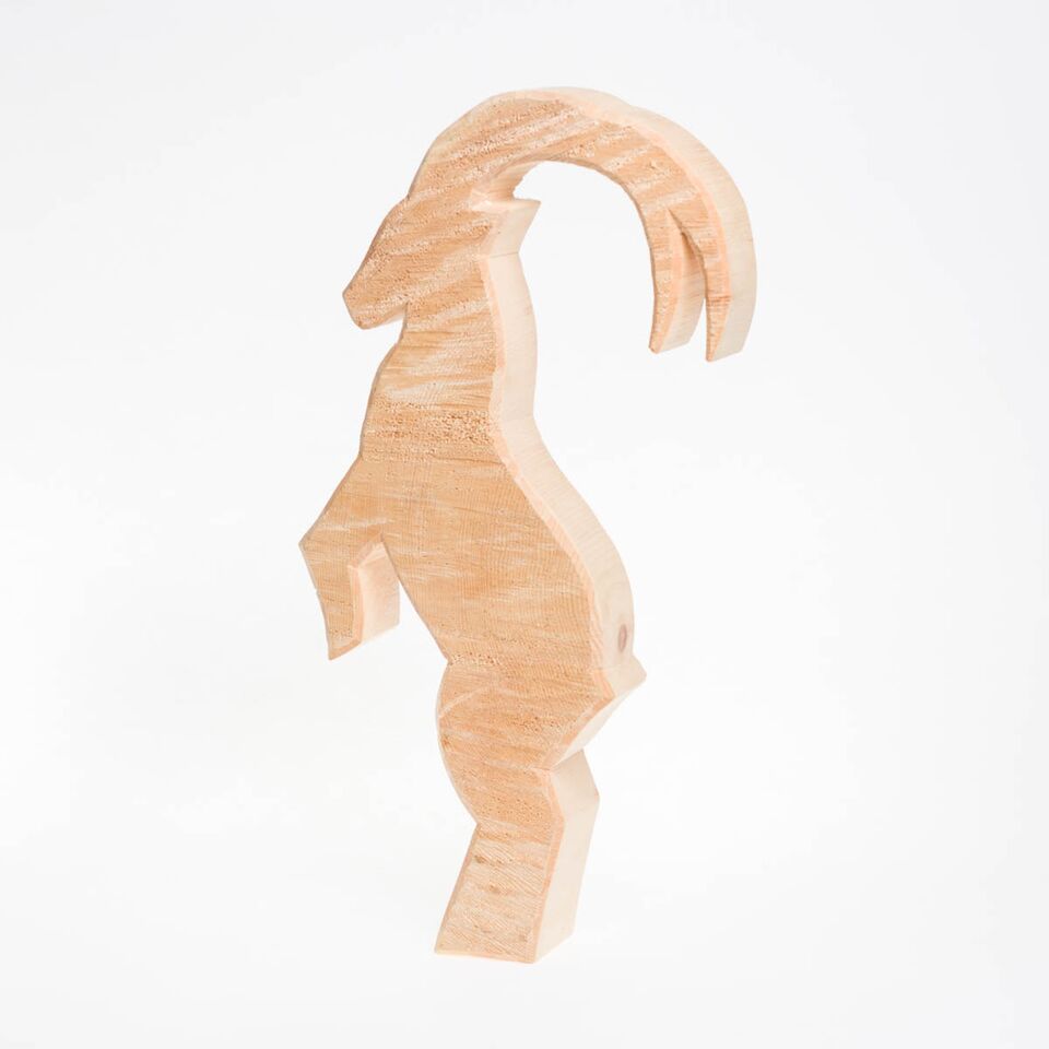 Steinbock in Arvenholz massiv, Sägetechnik aus Arvenholz-Baumscheiben ausgeschnitten.