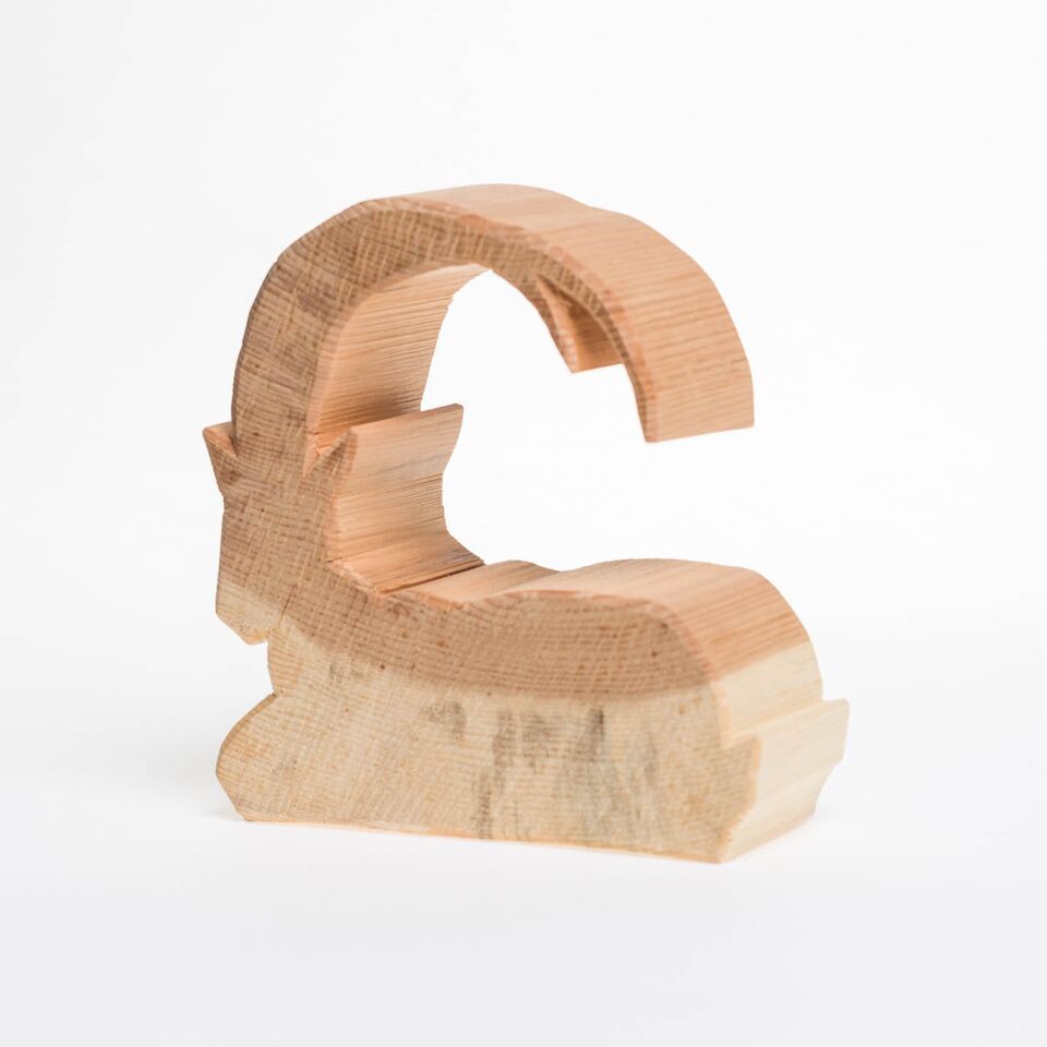Steinbock in Arvenholz massiv, Sägetechnik aus Arvenholz-Baumscheiben ausgeschnitten.