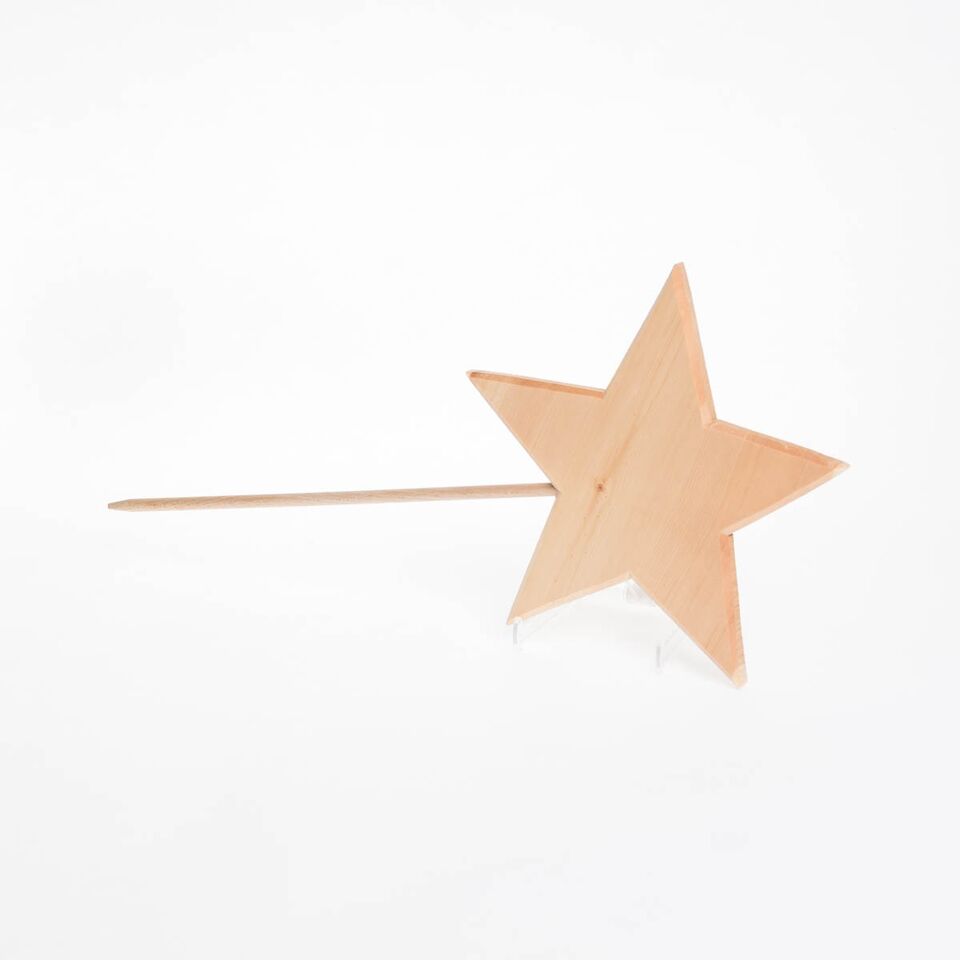 Stern mit Stab in Arvenholz massiv. Stern mit gerundeten Kanten und angespitztem Buchenholzstab. Der Stern kann in die Erde der Blumenkiste gesteckt werden.