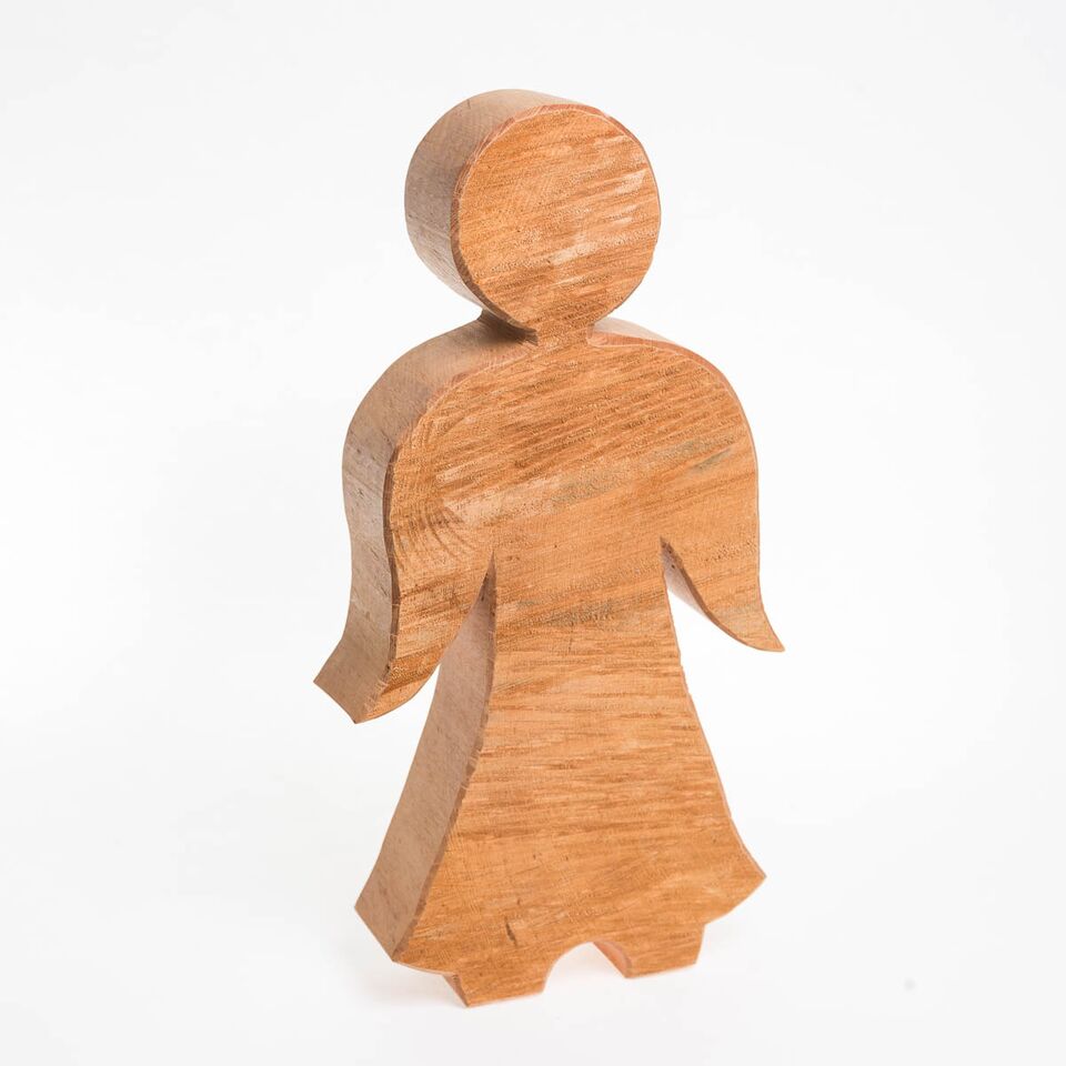 Zierengel in Arvenholz massiv, roh, aus Baumscheibe mit Kettensäge-, Bandsäge- oder Stichsägeschnitt.