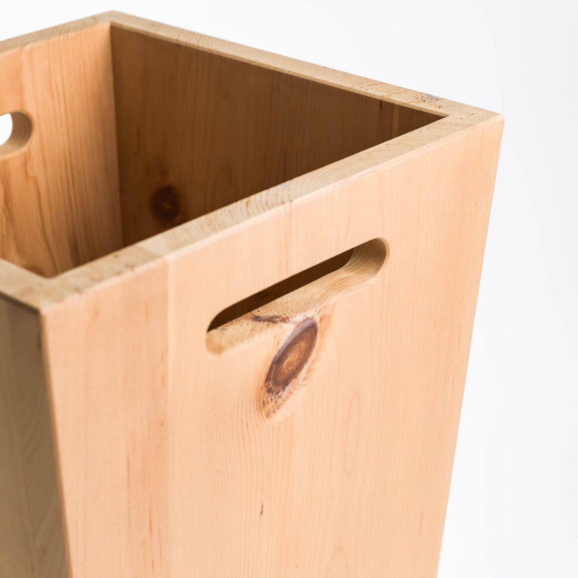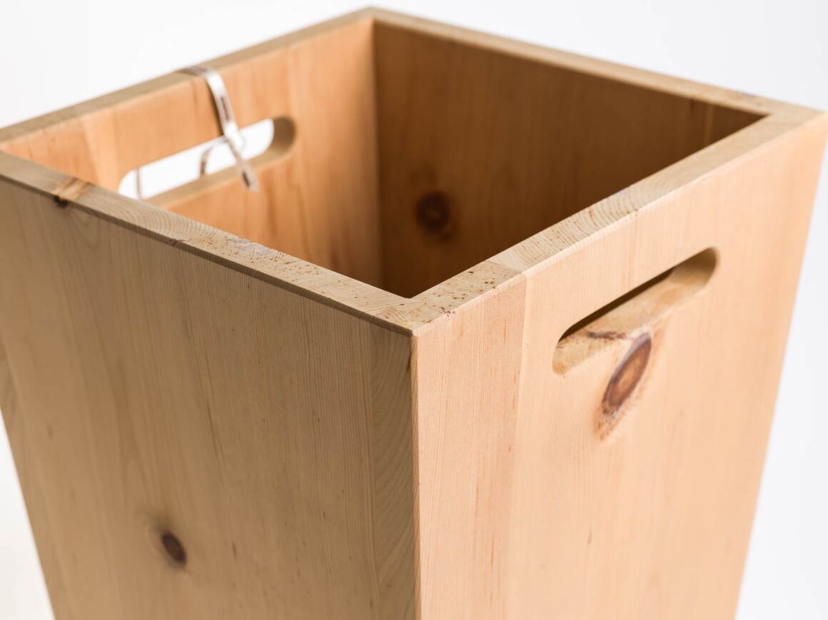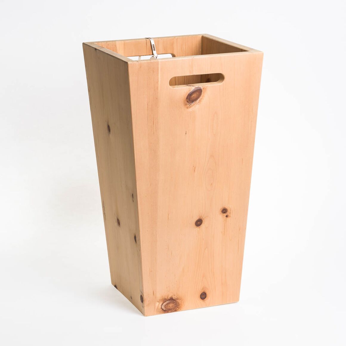 Schirmständer in Arvenholz massiv. Schirmständer, 4-eck, konische Form mit zwei eingefrästen Traggriffen.