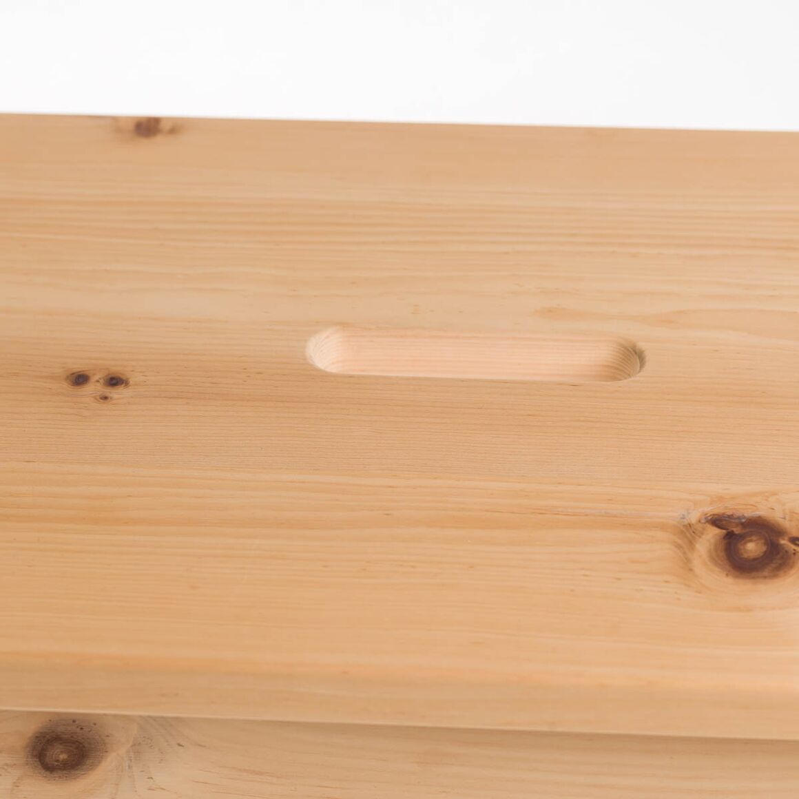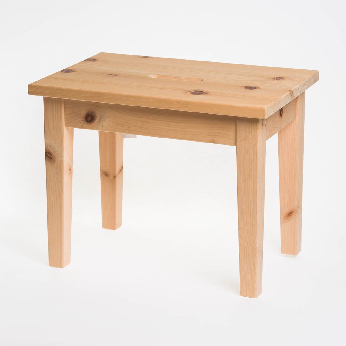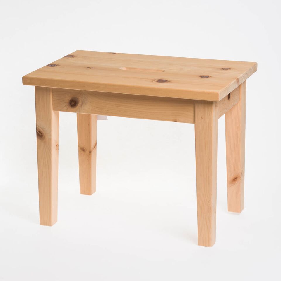 Schemel in Arvenholz massiv. Schemel mit 4 konischen Beinen und gestemmten Zargen. Blatt mit Griffaussparung.