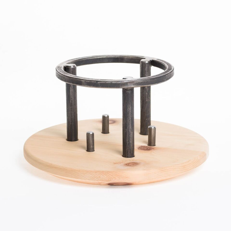 Fonduerechaud A in Arvenholz massiv. Rundes Bodenbrett mit Pfannen- und Rechaudhalter in Schmiedeeisen.