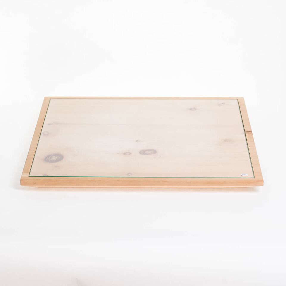Holz-Glasplatte in Arvenholz massiv. Quadratische Holzplatte mit Glasabdeckung. Die Holzplatte ist unten schräg nach innen abgeschrägt, die Kanten sind gefast und das glas ist auf der Oberfläche eingelassen. Das Glas hat geschliffene und poliere Kanten.