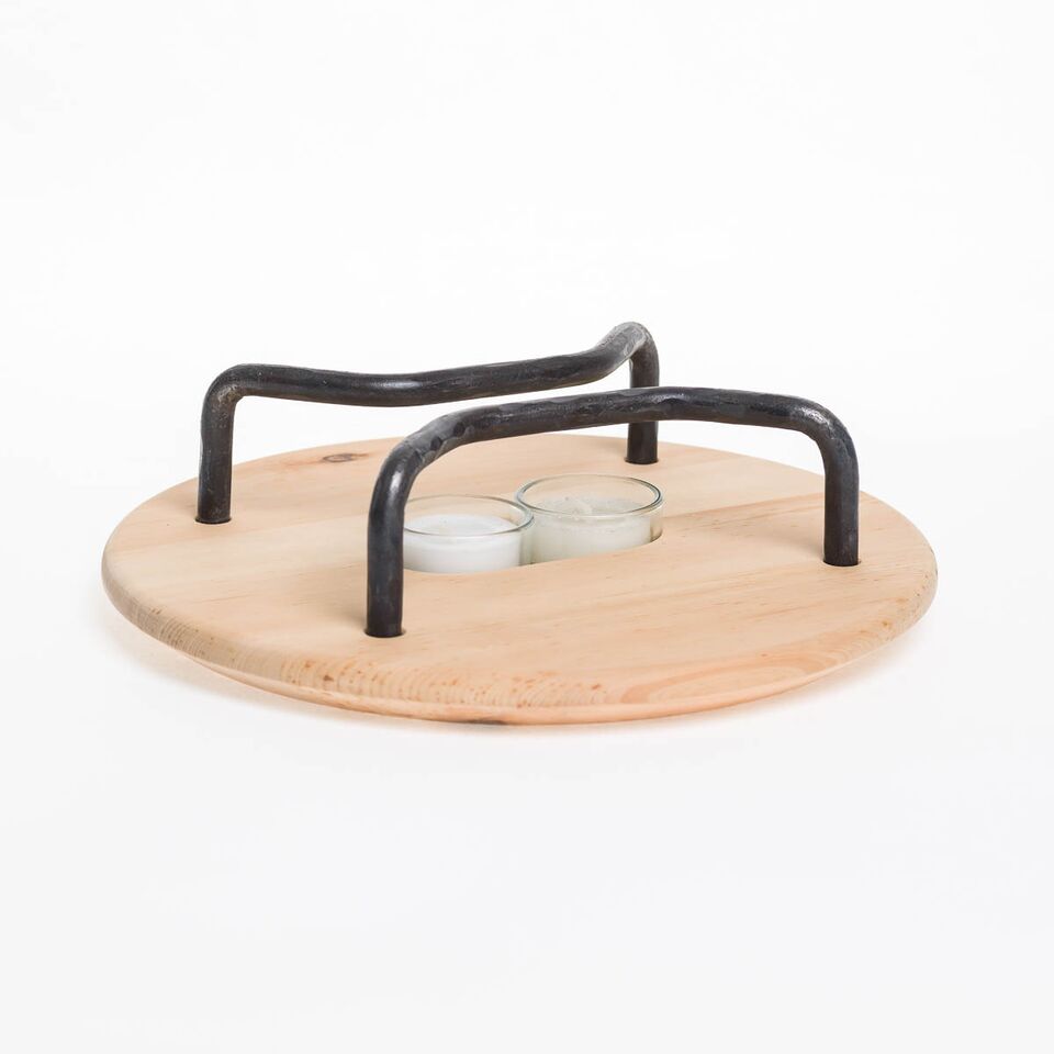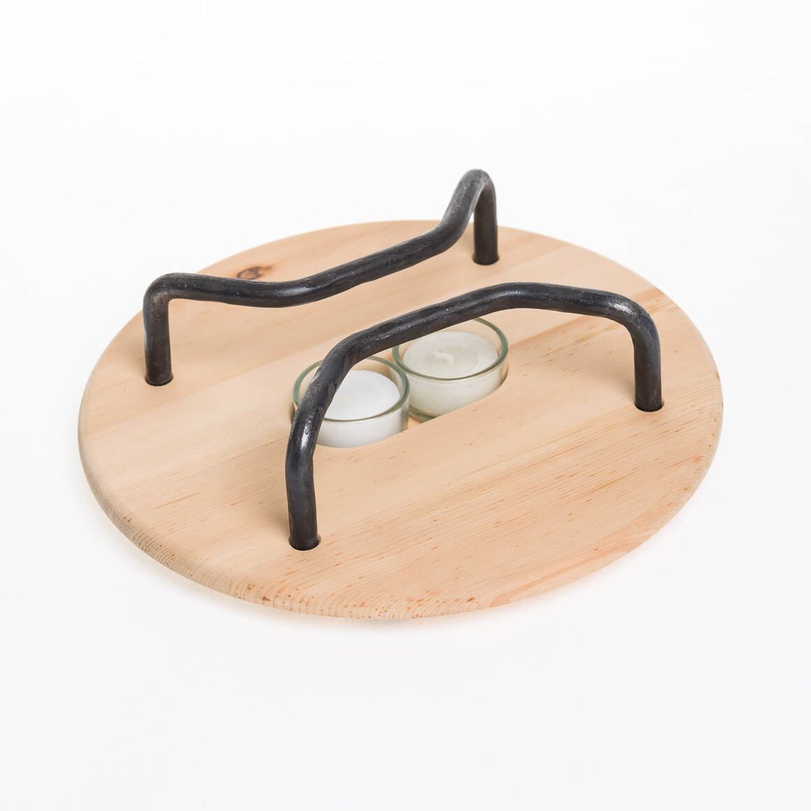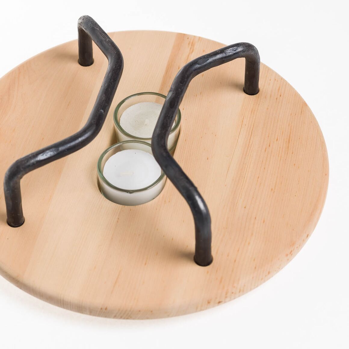 Rechaud in Arvenholz massiv. Rechaud um Platten warm zu halten, für einen Teekrug usw. Rechteckiges Bodenbrett mit je 2 Halter in Schmiedeeisen.