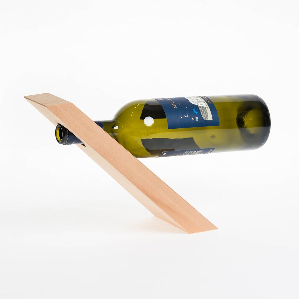 Weinflaschenhalter in Arvenholz massiv. Die Flasche kann so, in horizontaler Lage gelagert werden und am Tisch präsentiert werden.