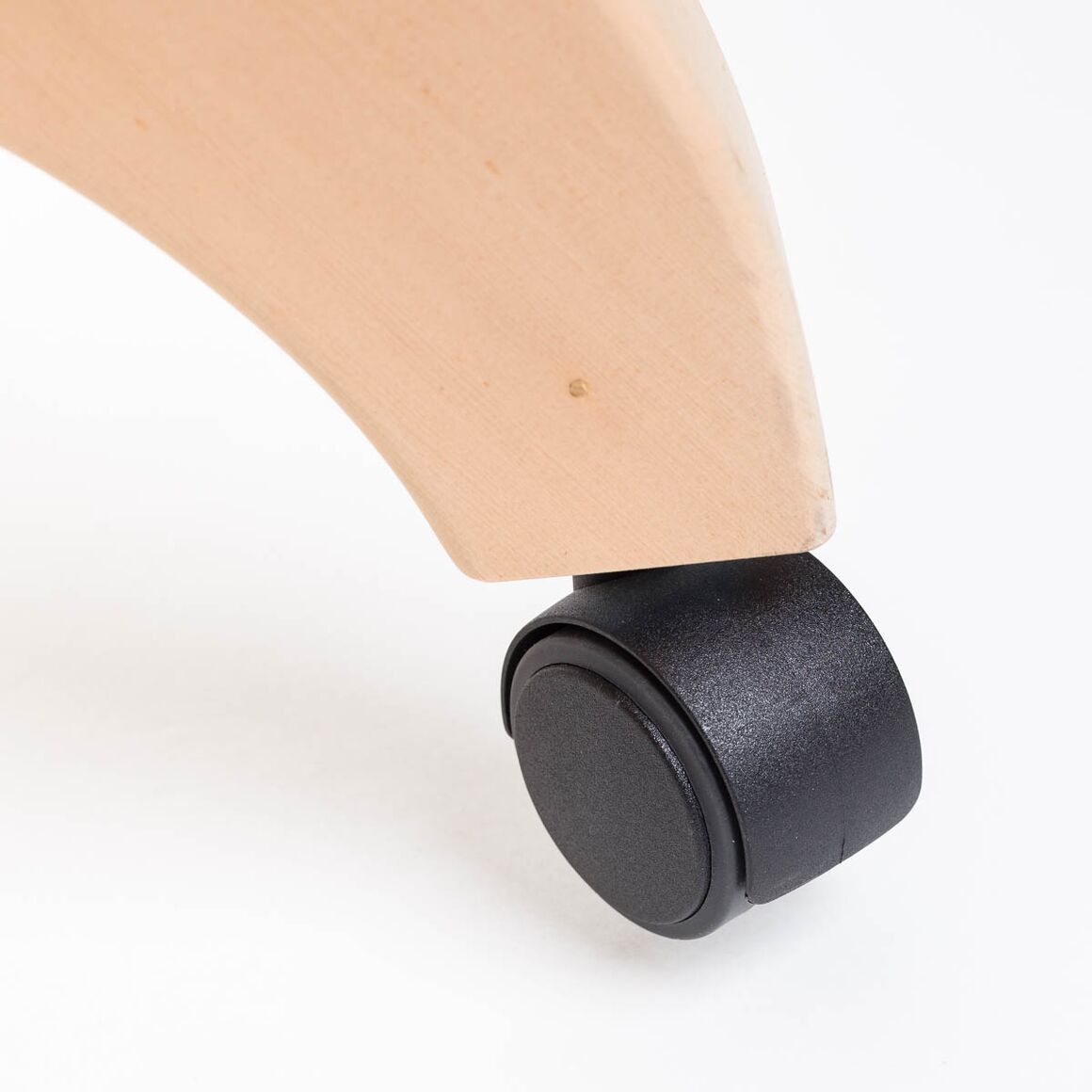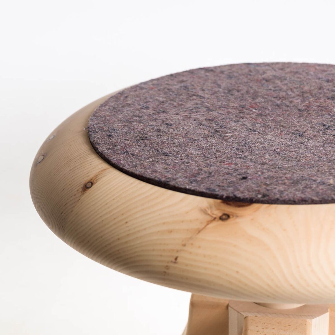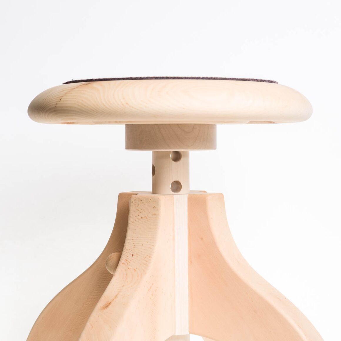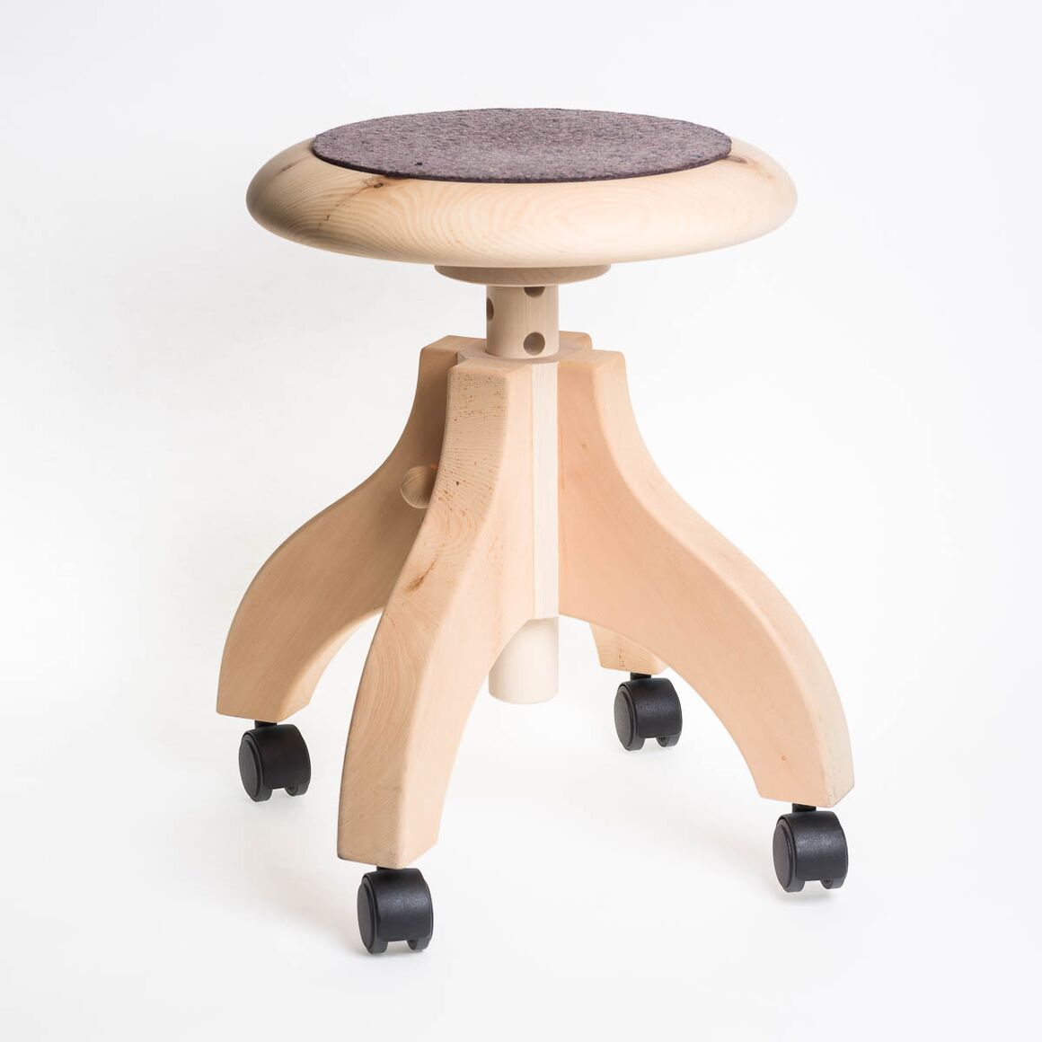 Bürohocker in Arvenholz massiv. Bürostuhl mit rund gedrechseltem Sitz. Sitz mit Wollfilzeinlage. Stuhl mit 4 geschweiften Beinen an einer Säule aus Ahornholz. Die Säule ist ausgebohrt. Der Sitz Stamm kann mittels eines Holznagels in der Säule auf beliebige Höhe eingestellt werden. Der Stuhl ist mit 4 leichtläufigen Möbelrollen ausgerüstet.