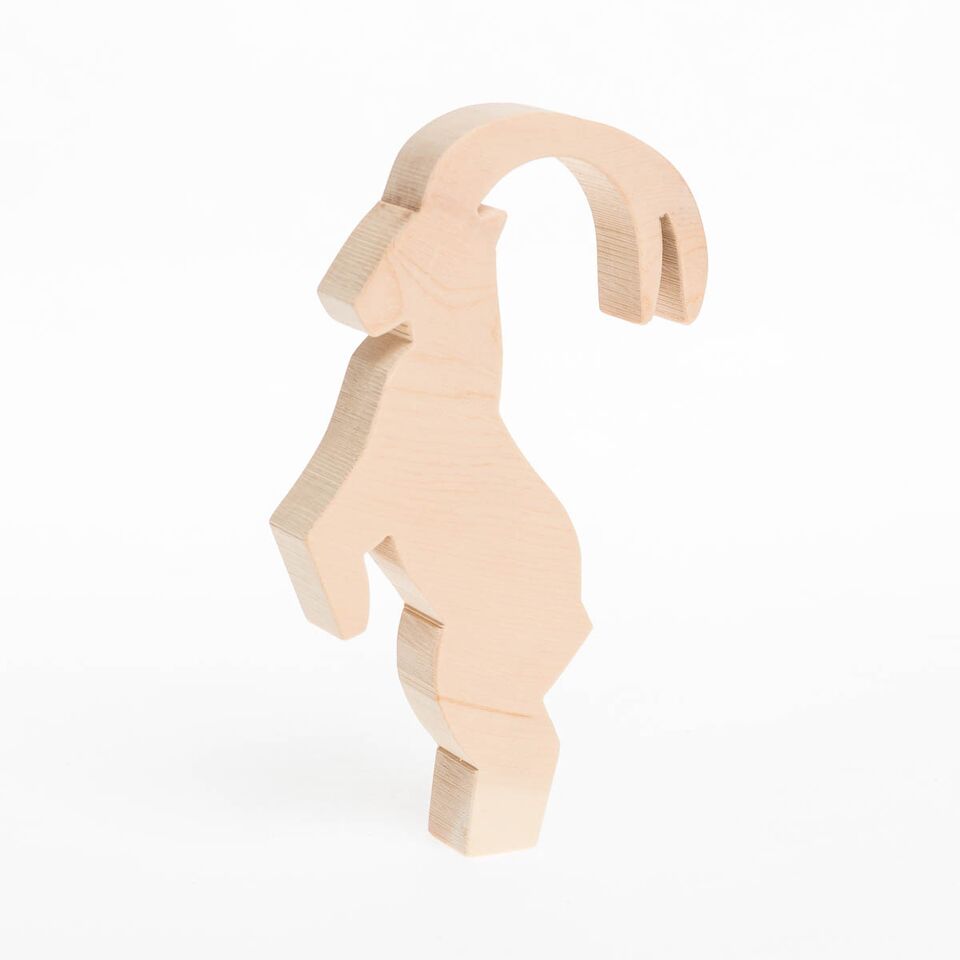Steinböckli in Arvenholz, aus einem Brett ausgesägt, die Flächen sind fein geschliffen und die Kanten gebrochen. Kann aufgestellt werden oder an den Hörnern aufgehängt. Sehr beliebt auch für Sternzeichen Steinbock.