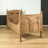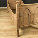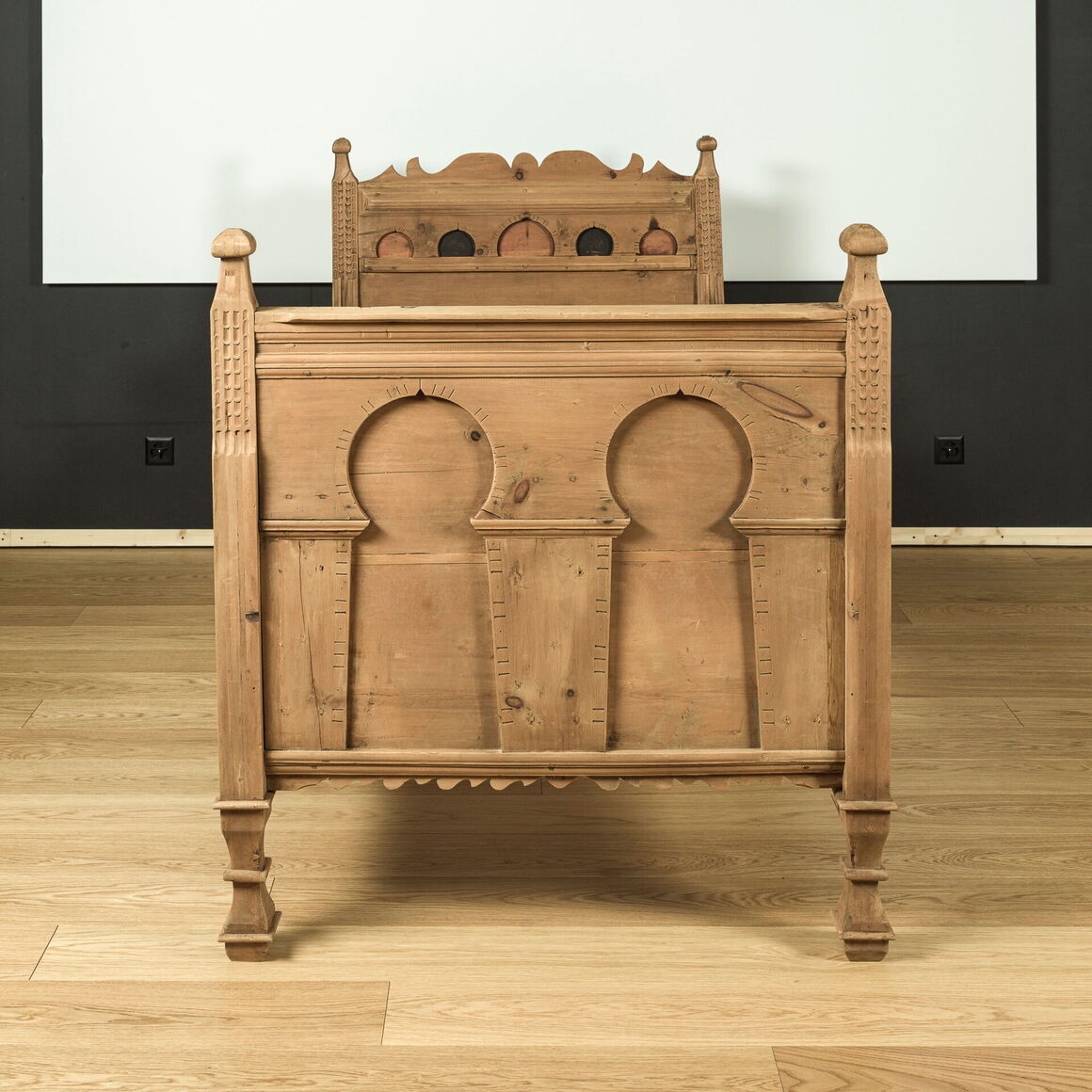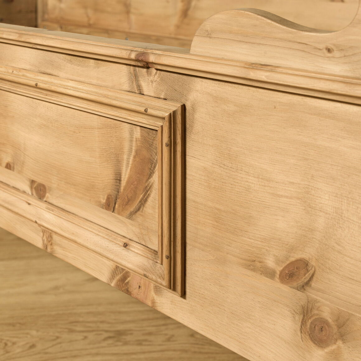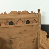 Die Bettseiten sind handwerklich eingezapft und mit Holznägeln befestigt. Die Bettteile sind fein geschnitzt und am Kopfteil sind gewisse Felder zierlich mit Pigmenten ausgefärbt, was dem Bett zusätzlich einen speziellen Charme verleiht.