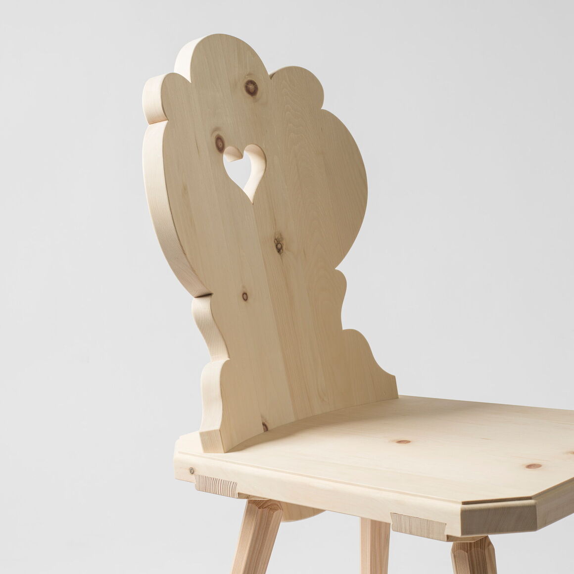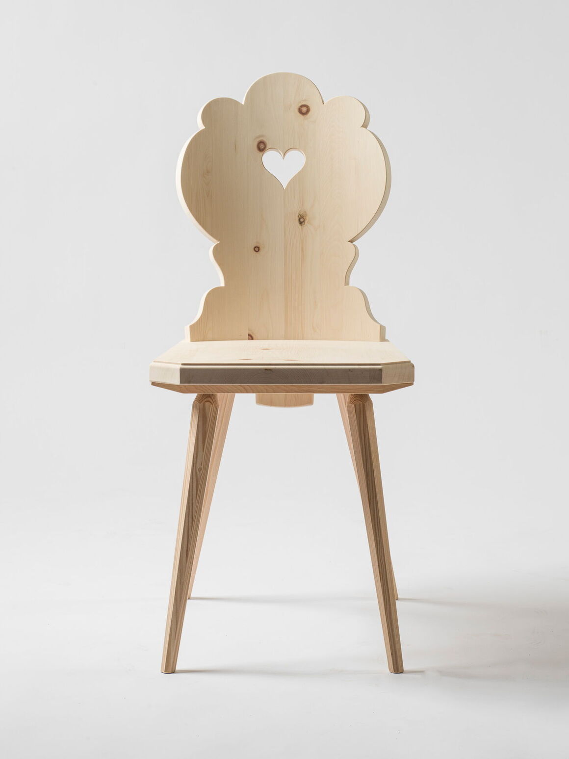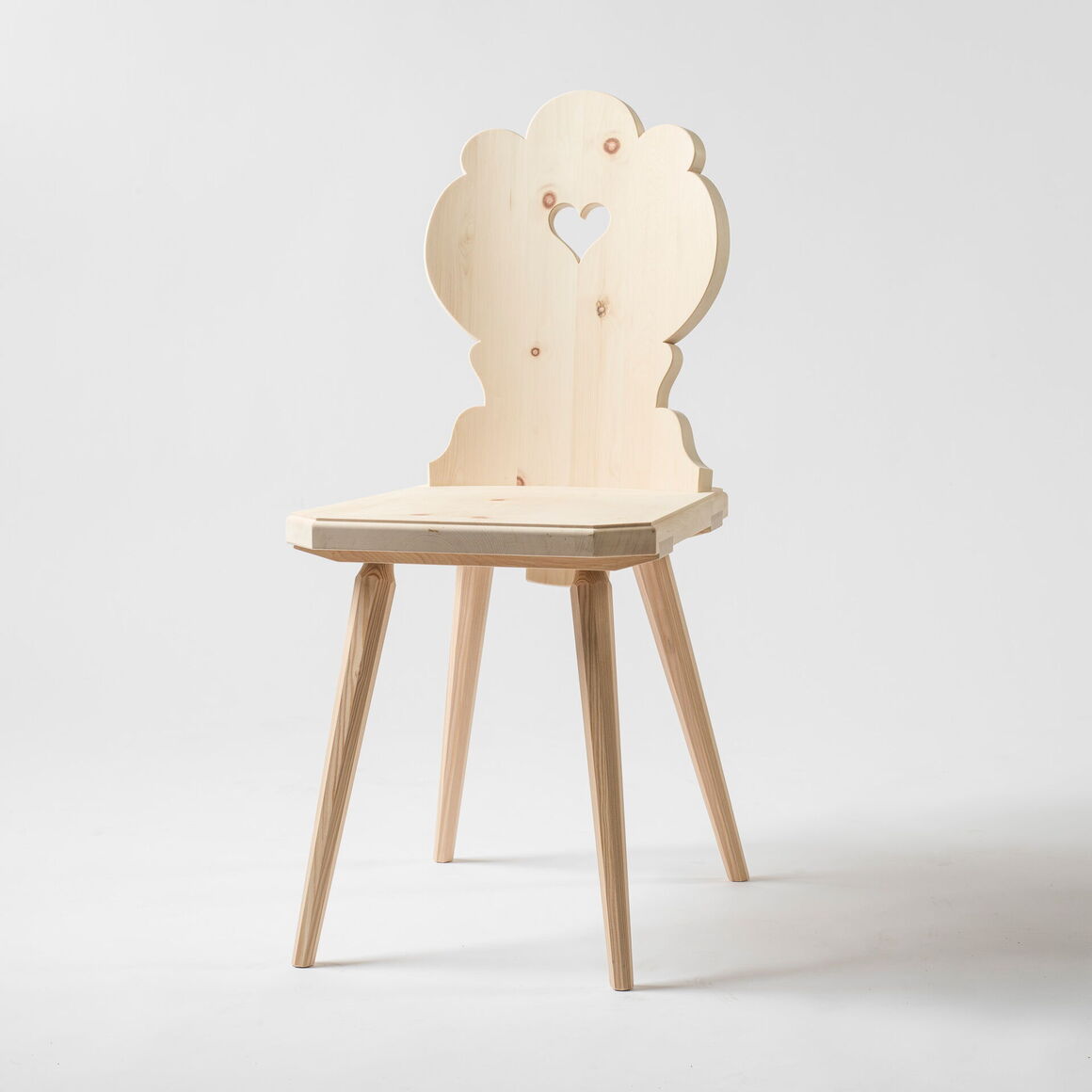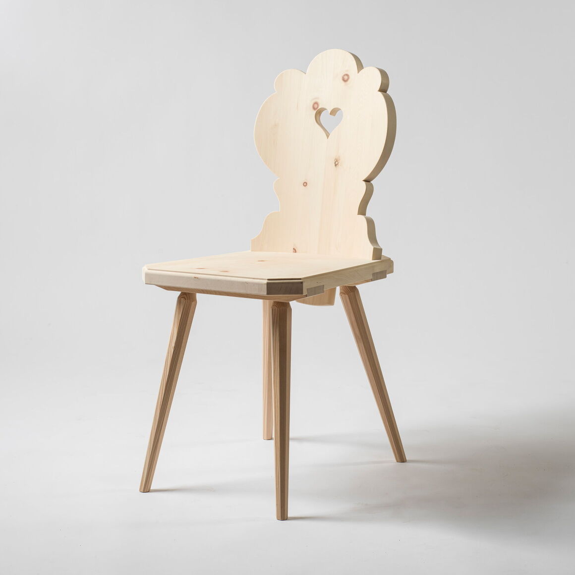Stabelle in Arvenholz massiv. Rückenlehne gerundet und geschweift. Gratleisten und Beine aus Lärchenholz.