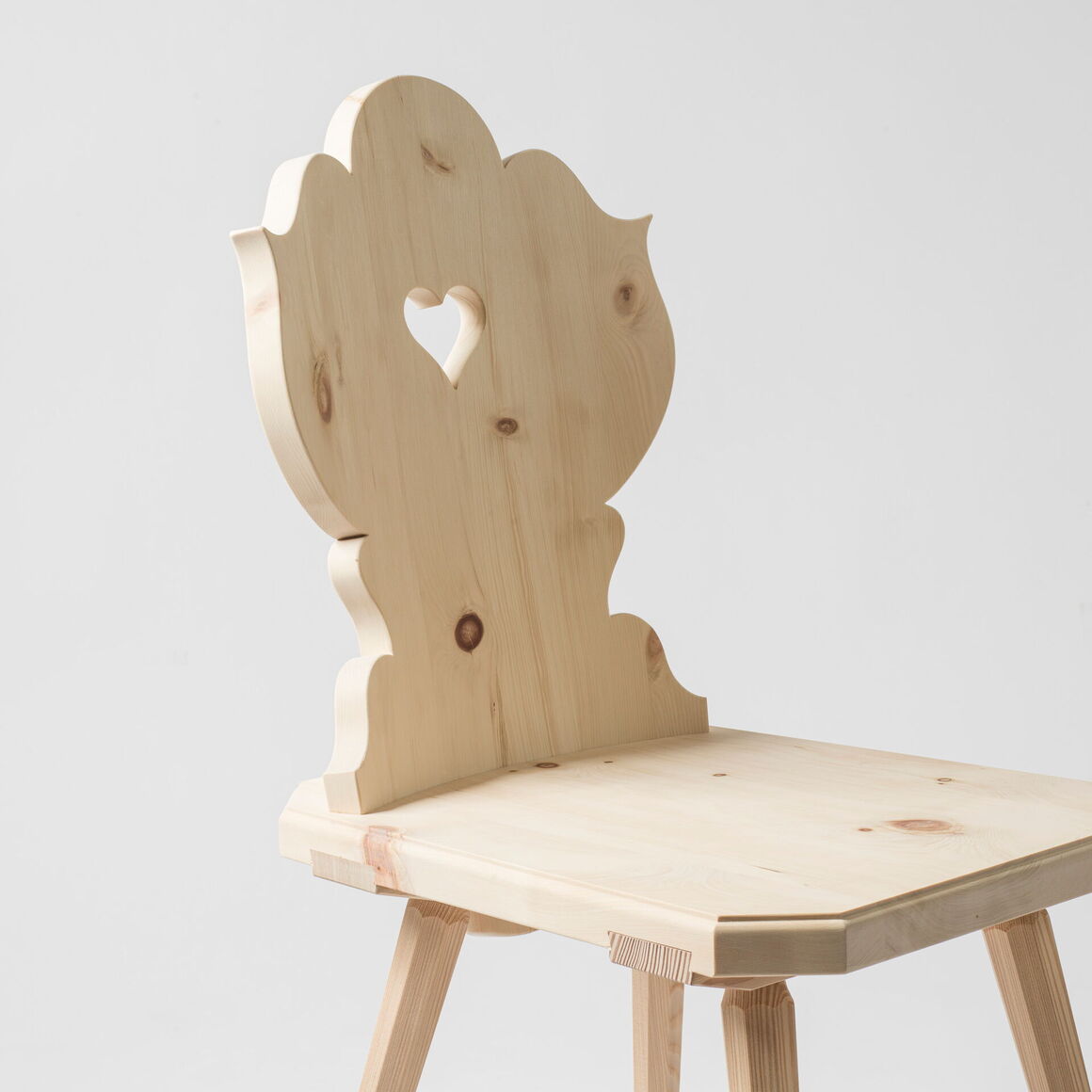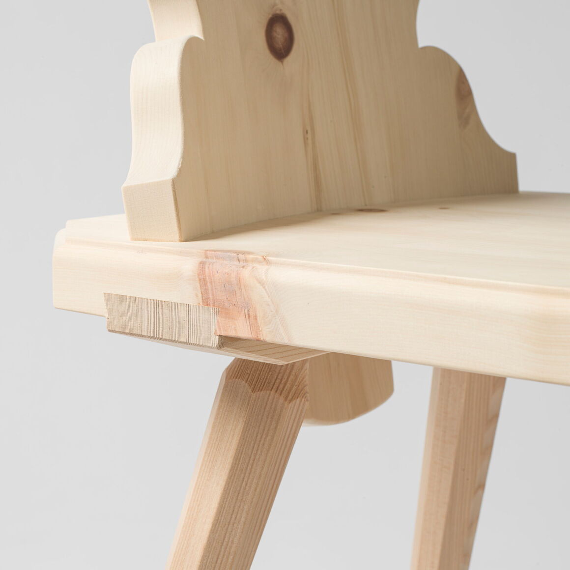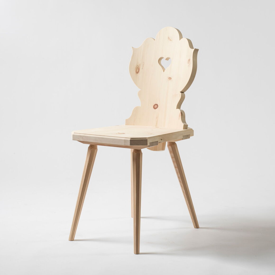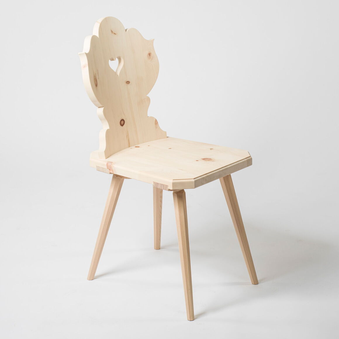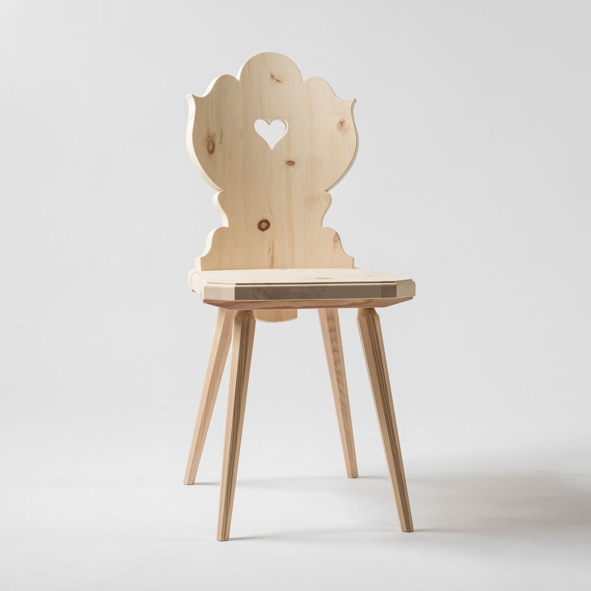 Stabelle in Arvenholz massiv. Rückenlehne gerundet und geschweift. Gratleisten und Beine aus Lärchenholz.